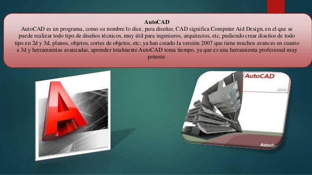 - 2. AutoCAD AutoCAD es un programa, como su nombre lo dice, para diseñar, CAD significa Computer Aid Design, en el que se puede realizar todo tipo de diseños técnicos, muy útil para ingenieros, arquitectos, etc, pudiendo crear diseños de todo tipo en 2d y 3d, planos, objetos, cortes de objetos, etc; ya han creado la versión 2007 que tiene muchos avances en cuanto a 3d y herramientas avanzadas, aprender totalmente AutoCAD toma tiempo, ya que es una herramienta profesional muy potente.