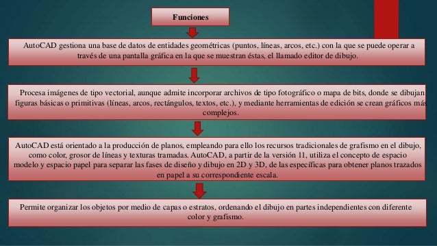 - 4. AutoCAD gestiona una base de datos de entidades geométricas (puntos, líneas, arcos, etc.) con la que se puede operar a través de una pantalla gráfica en la que se muestran éstas, el llamado editor de dibujo. AutoCAD está orientado a la producción de planos, empleando para ello los recursos tradicionales de grafismo en el dibujo, como color, grosor de líneas y texturas tramadas. AutoCAD, a partir de la versión 11, utiliza el concepto de espacio modelo y espacio papel para separar las fases de diseño y dibujo en 2D y 3D, de las específicas para obtener planos trazados en papel a su correspondiente escala. Procesa imágenes de tipo vectorial, aunque admite incorporar archivos de tipo fotográfico o mapa de bits, donde se dibujan figuras básicas o primitivas (líneas, arcos, rectángulos, textos, etc.), y mediante herramientas de edición se crean gráficos más complejos. Permite organizar los objetos por medio de capas o estratos, ordenando el dibujo en partes independientes con diferente color y grafismo.